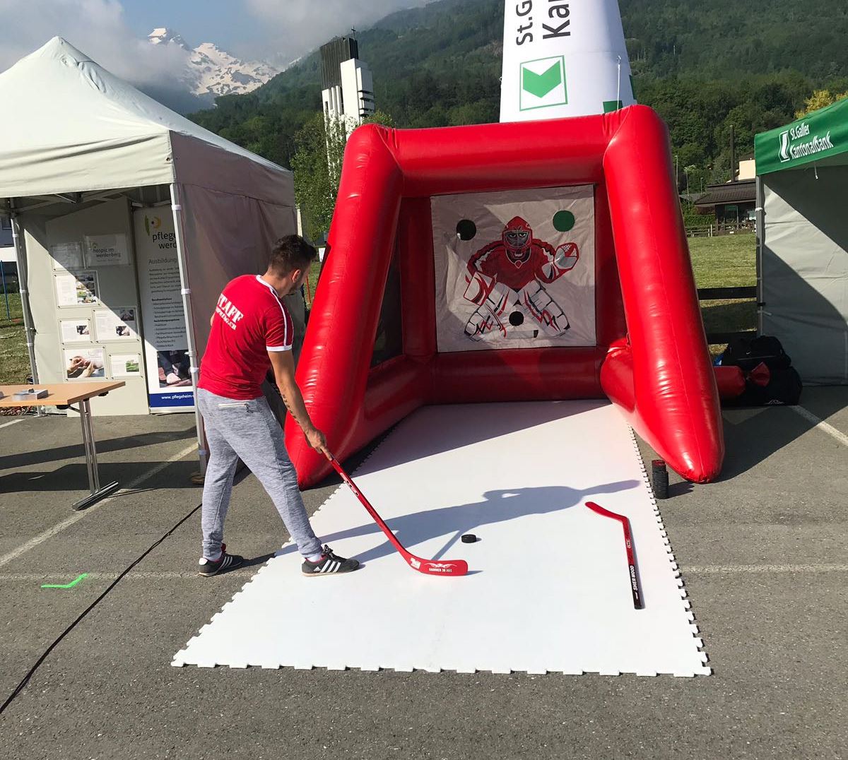 6 x 2.5 x 2.5m (Länge x Breite x Höhe). Die Torwand - jeder kennt sie. Doch bei dieser hier wird nicht etwa mit einem Ball, sondern mit Stock und Puck geschossen. Auf der synthetischen Kunststoffplatte wird wie auf Eis auf die Löcher gezielt. Mieten Sie die Eishockey-Torwand auch für Ihren Event! Info: Auch möglich mit Geschwindigkeitsmessgerät = Eishockey-Speedtest-Radar.