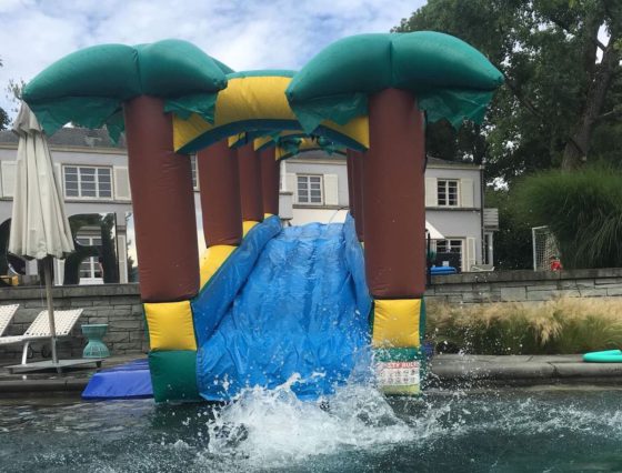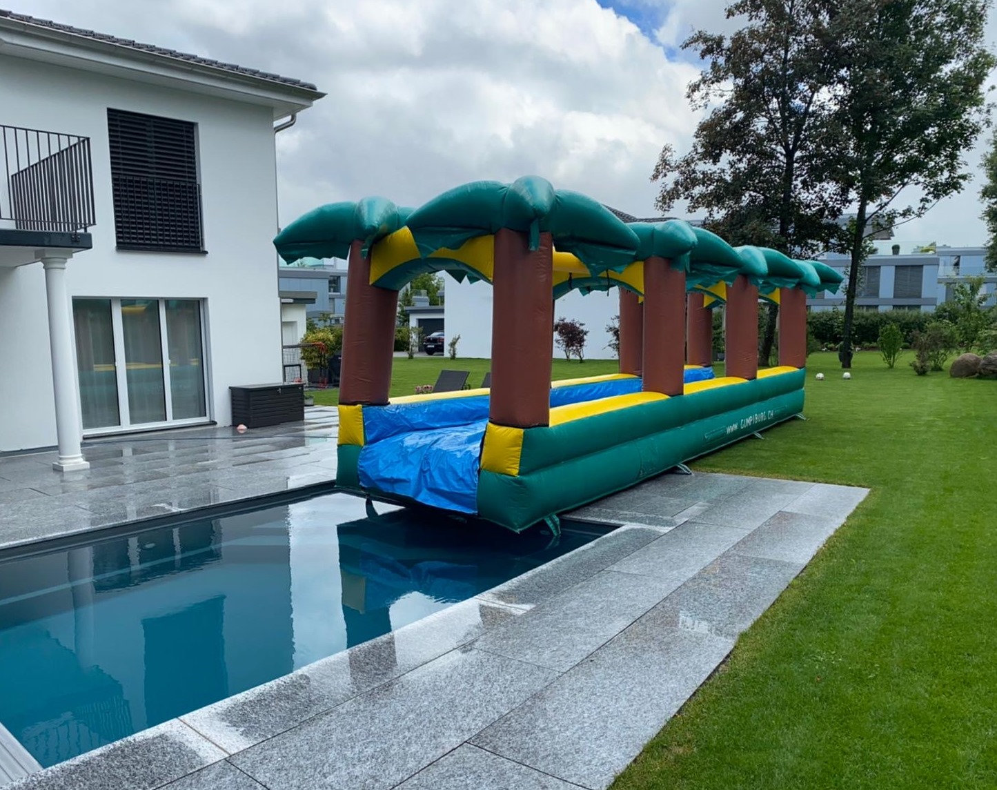 Spiel kann als Hüpfburg oder auch als Rutschbahn angewendet werden. 9 x 2.4 x 2.7m (Länge x Breite x Höhe). An heissen Sommertagen kann die Palmenbahn auch als Bauchrutsche angewendete werden. Bahn mit Wasser besprühen und auf dem Bauch rutschen - ein Spass für Gross & Klein.