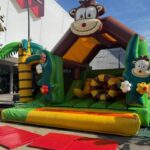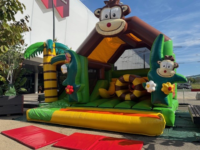 Die Umgebung der Hüpfburg ist mit Palmen und weiteren kleinen Affen gestaltet, um eine tropische und abenteuerliche Kulisse zu schaffen. Im Inneren gibt es kleine Spielelemente für zusätzlichen Spass!