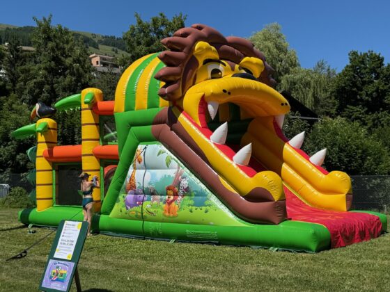 9.5 x 3.8 x 5.1m (Länge x Breite x Höhe). Rutschen, klettern, hüpfen, chillen, Bifbash .. auf dieser tollen Hindernisbahn können sich die Kinder austoben und Spass haben. Schönes Dschungeldesign mit Löwen, Tucan, Nilpferd, Papageien, usw. Inkl. Gebläse 230V, Unterlagsplane, Schutzmatten für Eingangsbereich, Befestigungsmaterial, Kabelrolle