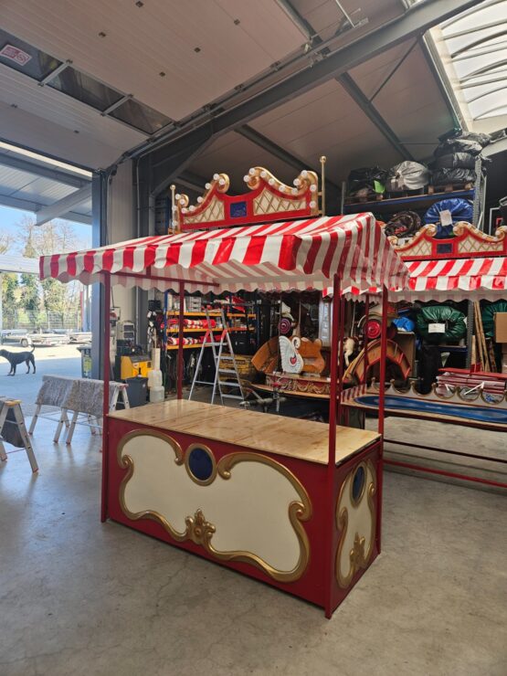 Grösse 2 x 0.9 x 2.8m. Nur für gut zugängliche Orte geeignet. Ein toller Marktstand im Nostalgie-Jahrmarkt-Look. Egal ob als Verkaufsstand, Dekoration oder Tisch für Spiele - unser Markstand sieht einfach immer toll aus!