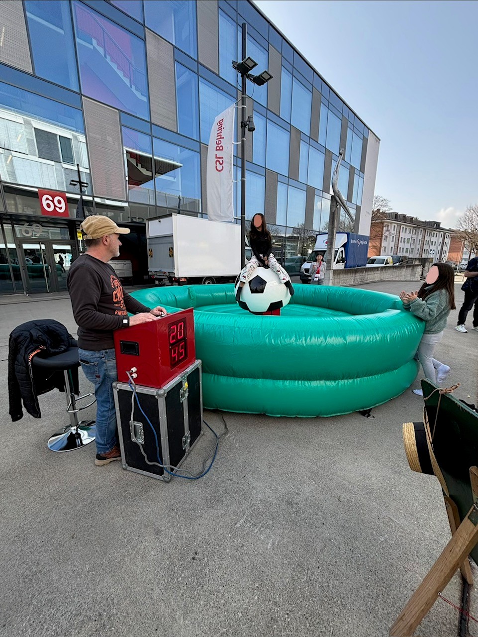 Das unvergessliche Fussball-Erlebnis! Mieten Sie ein topmodernes Fussball-Rodeoreiten inklusive Bedienpult, LED-Zeitanzeige und unterschiedlichen Schwierigkeitsgraden als Attraktion für Ihren Event. Sicherheit ist bei diesem Spiel durch den Sicherheitsstop und einen weichen Fall jederzeit gegeben. Der "Reiter" versucht, sich am kurzen Strick festzuhalten und nicht runter zu fallen. Stellt sich also nur noch die Frage: Wer bleibt am längsten auf dem Fussball sitzen?